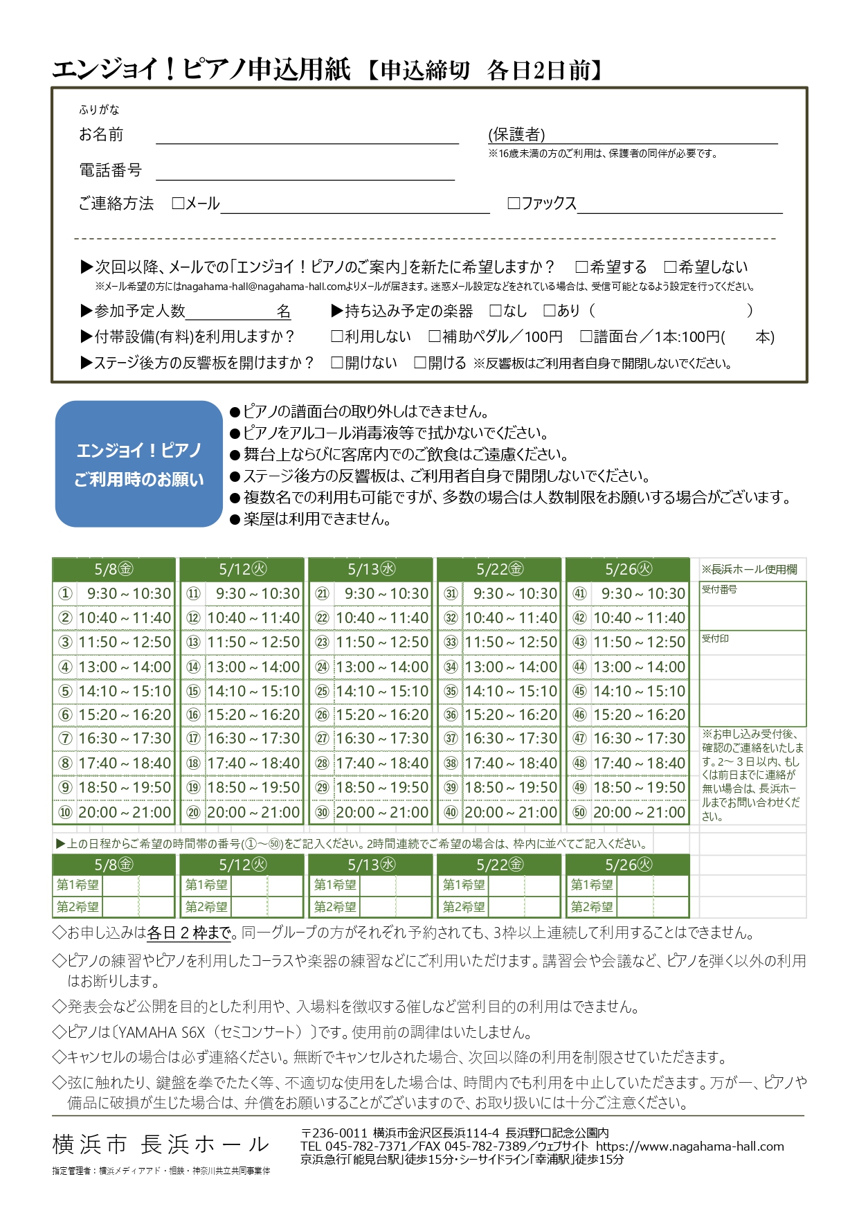 【長浜ホール エンジョイ!ピアノ ご利用時のお願い】